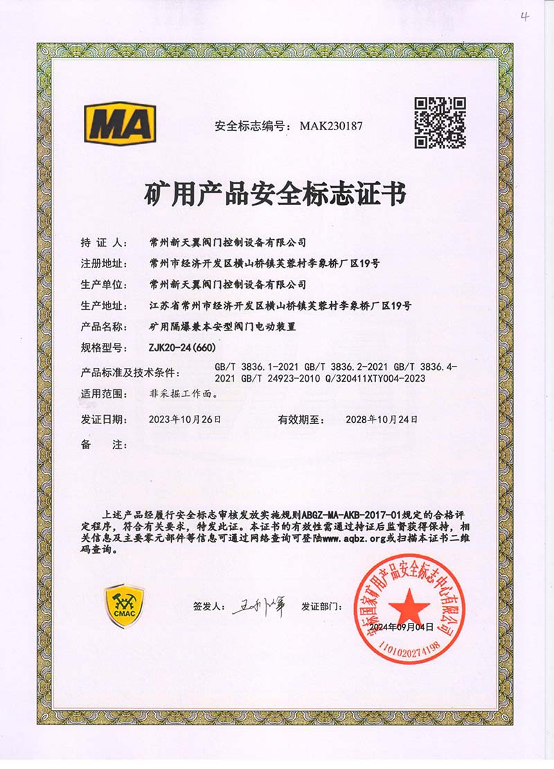 礦用產品安全標志證書ZJK180-24(380)